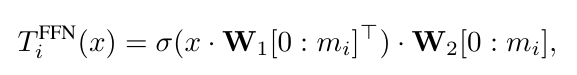 通常,d_ff 是 d_model 的几倍,通常是四倍。例如,在 BERT Base 模型中,d_model 是 768,而 d_ff 是 3072。这种扩展-收缩模式使 FFN 块既参数密集又是一个理想的嵌套候选,因为它提供了大量的多粒度优化空间。