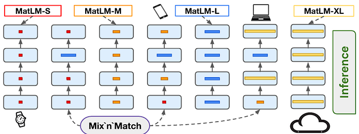 更具体地说,上图说明了七个可部署的模型,它们可以在从智能手表到云服务器的各种设备上运行。其中,只有四种变体是显式训练的:MatLM-S、MatLM-M、MatLM-L 和 MatLM-XL。其余三种是通过 混搭 策略隐式推导出来的,这意味着它们可以直接用于推理而无需任何额外的训练。