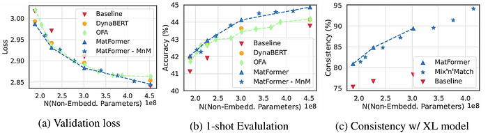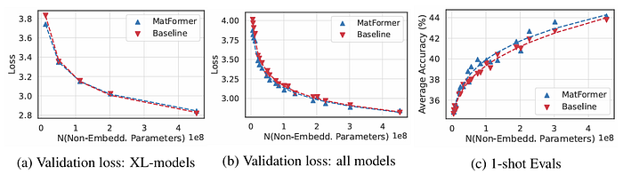 为了回答第一个问题,作者进行了实验,将 MatFormer 与其基线(即标准的 Transformer 模型)进行了比较。如下面的图所示,MatFormer 在验证损失(a)和 1-shot 评估(b)方面实际上优于其基线。