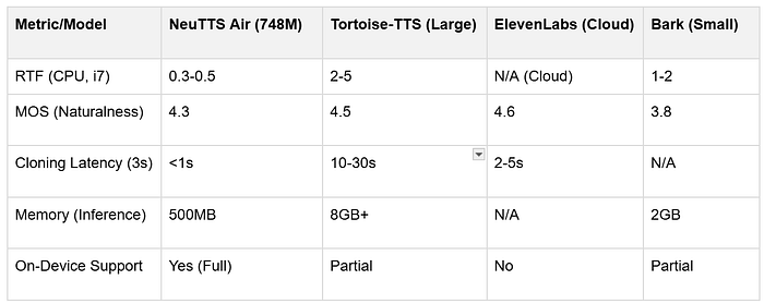 虽然NeuTTS Air的模型卡强调了“同类最佳的真实性”,但定量基准正在社区测试和供应商声明中出现。作为最近发布的模型,正式评估如MOS(平均意见得分)或WER(词错误率)有限,但初步结果突出了其在效率调整性能方面的优势。
