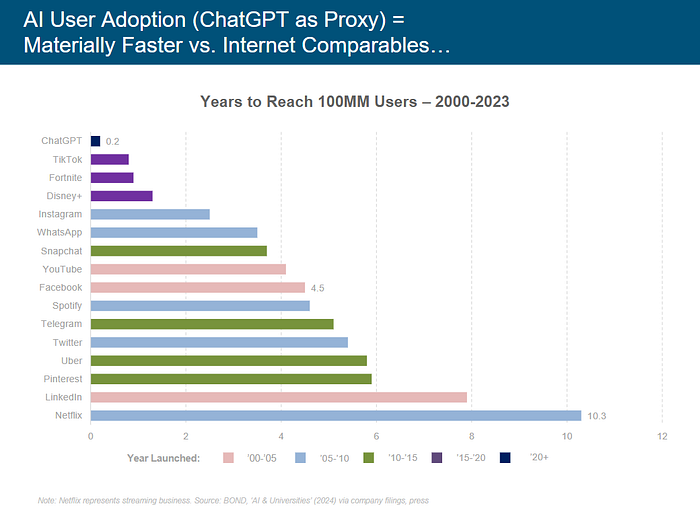 电话花了 50 年才普及到一半的美国家庭。电视花了 30 年。互联网花了 23 年才达到 90% 的普及率。