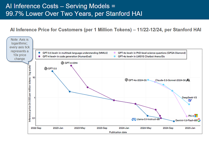 想象一下,如果法拉利花费100亿美元研发一款超级跑车,但每英里只需几美分就能让你驾驶它。这基本上就是人工智能现在正在发生的事情。生成一百万个代币(大约75万个单词)的成本已从数百美元暴跌至区区几美分。