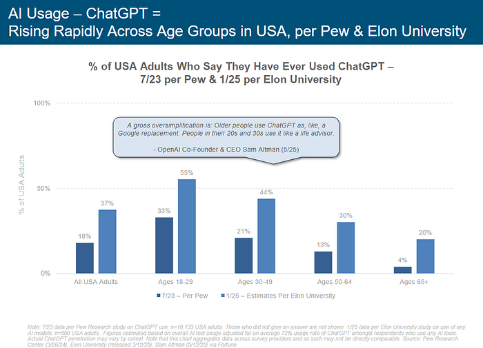 数据中最令人惊讶的发现之一是人口统计:10% 的 65 岁以上美国人使用过 ChatGPT(比 2023 年翻了一番)。你那讨厌科技、还在打印电子邮件的叔叔?他很可能正在向 ChatGPT 寻求食谱建议。