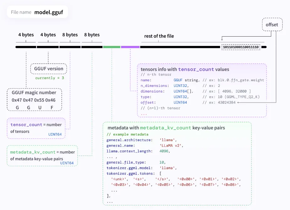 另一种文件格式是GGUF(GPT-Generated Unified Format),它支持LLM的优化管理。GGUF可以存储张量加上元数据,并支持不同类型的量化和微调。