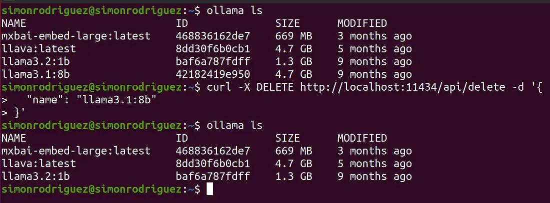 - /api/delete: DELETE 方法。相当于 ollama rm 命令,用于从本地系统中删除一个模型。