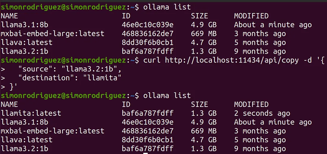 - /api/copy: POST 方法。相当于 ollama cp,用于在本地复制一个现有的模型。