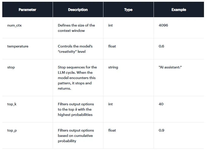 这些是最相关的参数,但还有许多其他参数。根据与Ollama的交互模式(CLI、API、modelfile),并非所有参数都可以配置。