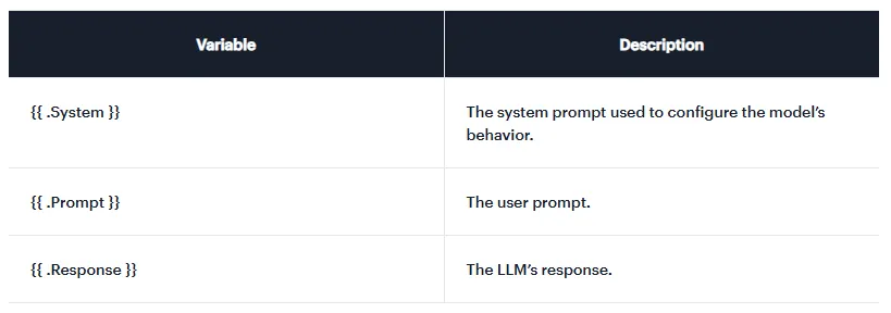 - TEMPLATE:用于定义LLM输入提示格式结构的指令。这是聊天或基于指令模型非常重要的一条指令,因为模板指定了系统消息、用户回合、助手回合等是如何分隔的,以确保问答循环的正确运行。模板使用Go模板语法编写。关键变量是: