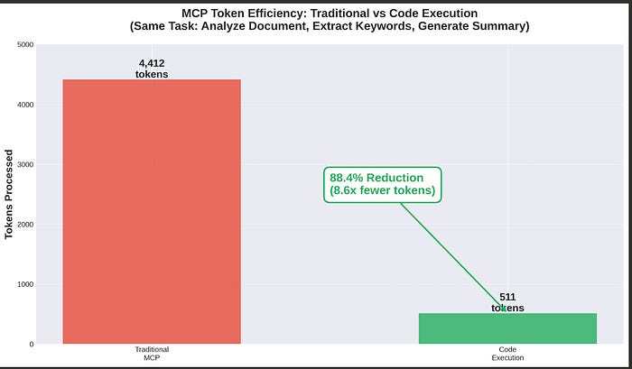 Anthropic 在其生产系统中测量了令牌数量的减少——从 150,000 个令牌减少到 2,000 个令牌,改进了 98.7%。这种模式在大规模应用时会变得非常糟糕: