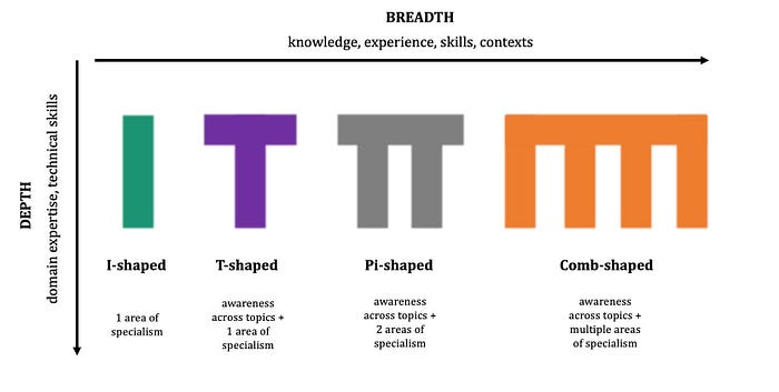 - π型:两项深厚技能 + 广博知识;双重专长(例如,用户体验设计 + 前端代码);关注双重深度
