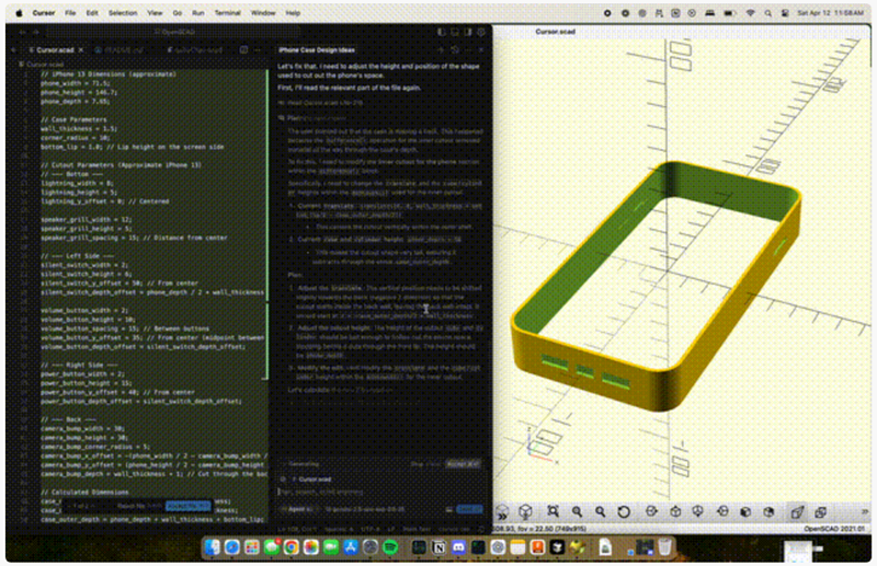 几周前,我受到最近使用LLMs驱动Blender的启发(blender-mcp,一个广泛用于动画的开源建模工具)。鉴于LLMs在生成代码方面非常出色,或许可以使用CAD建模的程序接口以类似的方式生成实体模型。我立刻想到了OpenSCAD,这是一个已经开发了15多年的开源程序化CAD工具。用户不是使用点对点软件创建实体模型,而是编写软件脚本,然后将其渲染为实体CAD模型。