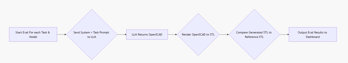 我对这些初步结果印象深刻,但我想要了解更多。例如,模型的推理能力是否帮助它思考创建零件的步骤?因此,我决定开发一个评估,以测试各种LLMs通过OpenSCAD生成实体模型的性能。
