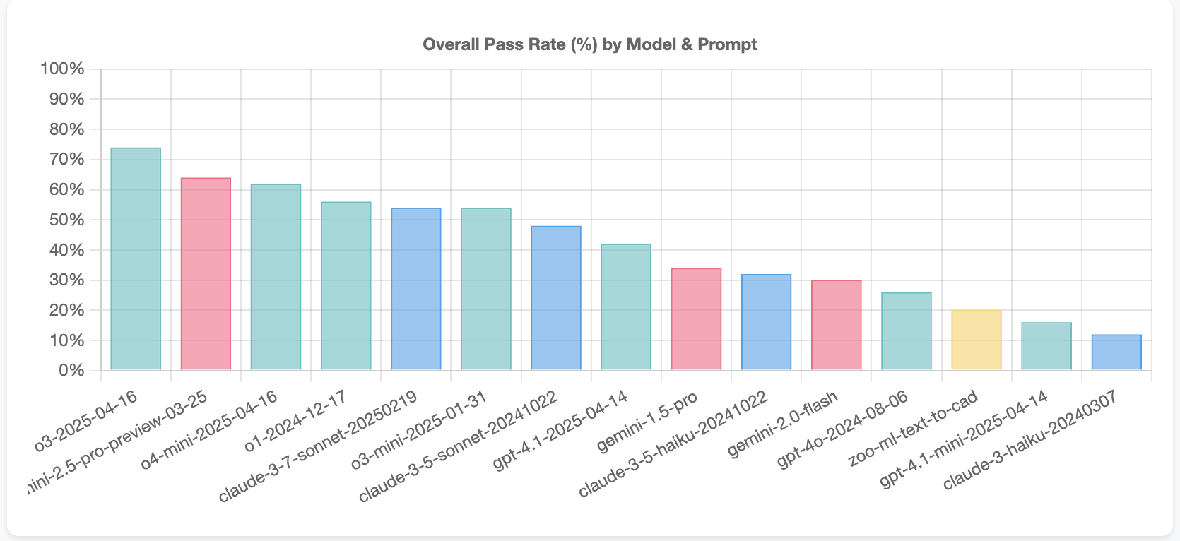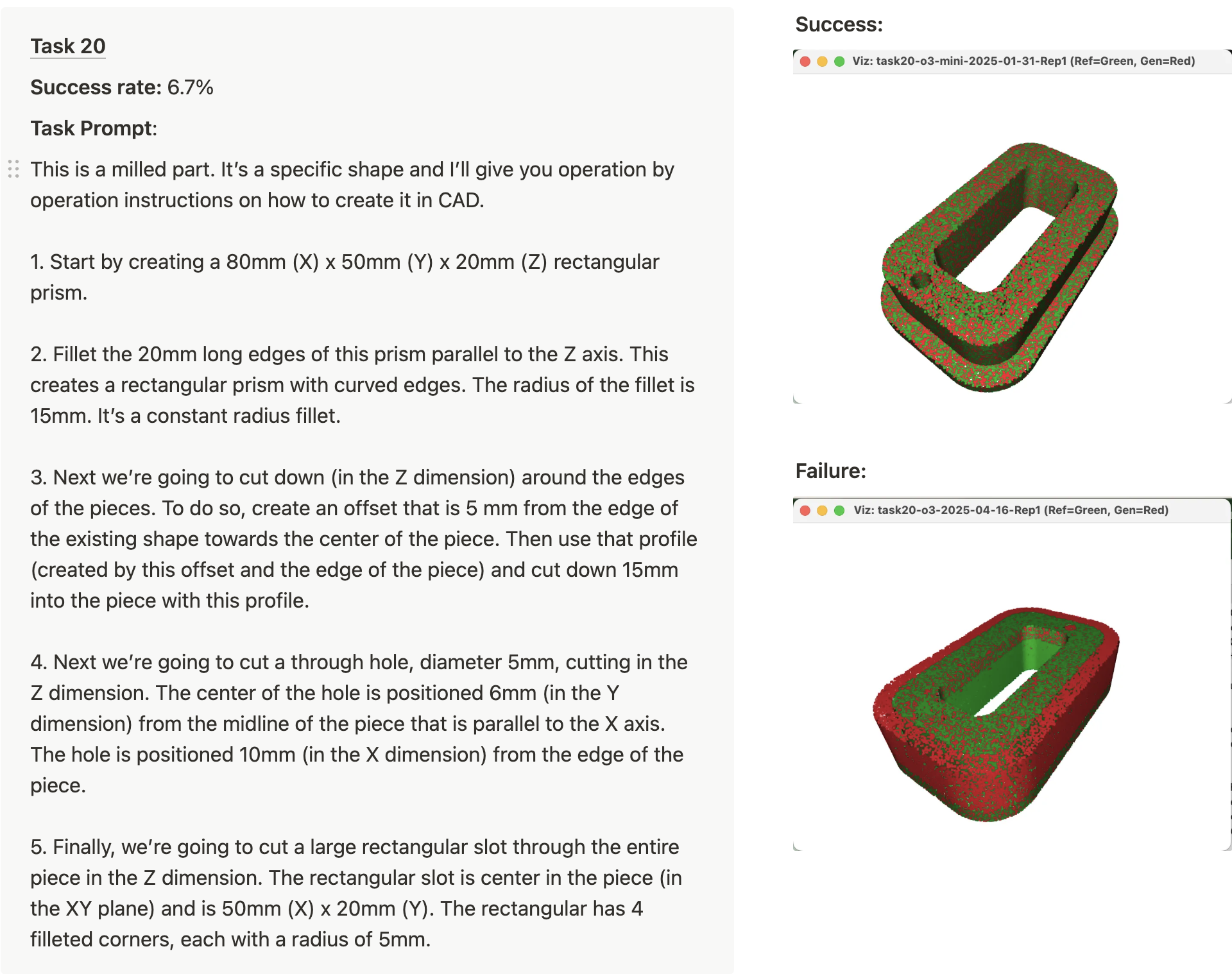评估流程有几个地方可以改进。特别是,假阴性很常见(估计:~5%)。我还注意到,偶尔一些小特征(比如小半径的圆角)不会被自动几何检查捕捉到。尽管如此,评估流程仍然足够好,可以看到有趣的结果并比较不同LLMs的性能。