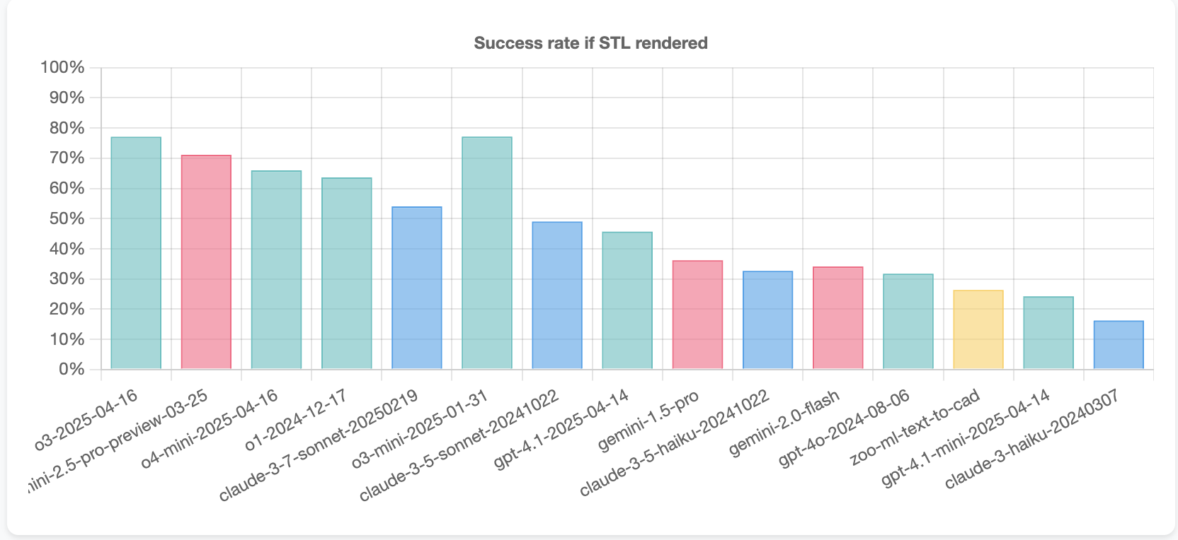 此外,我们可以查看成功渲染STL的任务的成功率。o3-mini表现非常强劲,几乎与全尺寸o3模型相同,而Sonnet 3.7似乎落后于领先的Gemini 2.5 Pro和o1, o3, o4-mini, 和o3-mini模型。