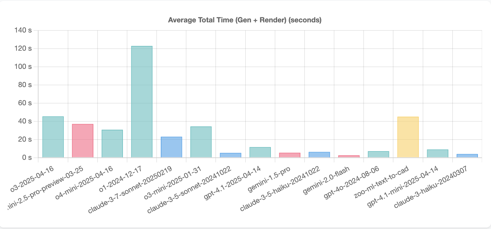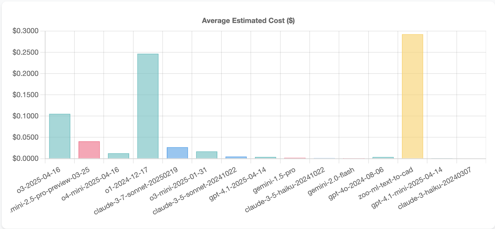 我把Zoo加入了评估流程,以与LLM -> OpenSCAD -> STL进行比较。Zoo.dev API直接返回STL,而不是生成OpenSCAD。Zoo表示他们使用专有的数据集和机器学习模型。令我惊讶的是,Zoo的API在与LLM生成STL(通过创建OpenSCAD)相比时表现并不特别好。尽管如此,我很期待看到Zoo.dev的发展,我将热切期待Zoo.dev未来模型的发布与LLM生成OpenSCAD的比较。