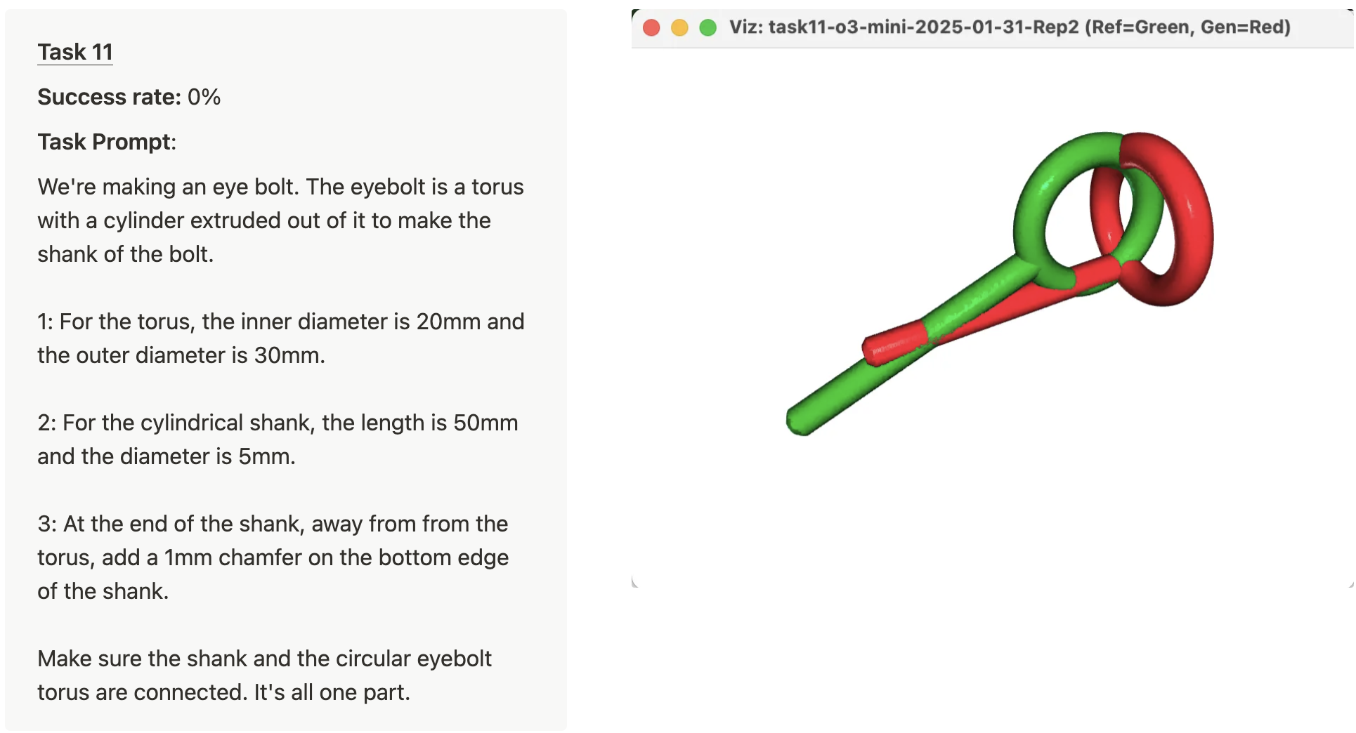 这些失败既有趣又完全不同。任务11是糟糕空间推理的典型例子。在图像中突出显示的具体失败中,模型将眼螺栓的杆垂直于环面(而不是在同一平面内)进行拉伸。任务15是另一种失败模式。在附带的图像中很难看到,但如果你仔细放大,可以看出生成的形状略微大于参考形状(这与生成的STL未能通过体积检查是一致的)。从查看该示例的OpenSCAD代码来看,失败似乎是由于使用了OpenSCAD的hull操作,这与loft操作并不完全相同。OpenSCAD没有内置的loft操作。
