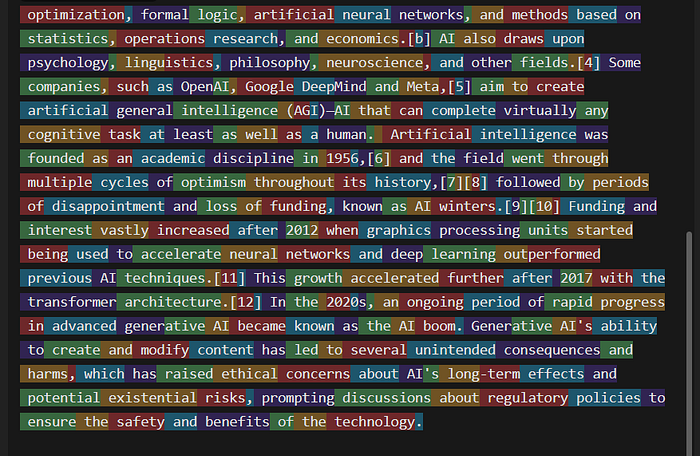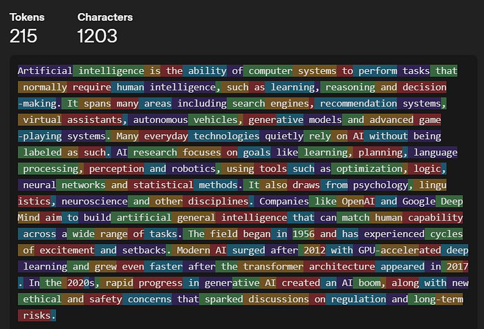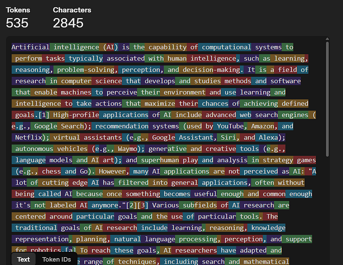 考虑以下关于人工智能的段落,它直接取自 Wikipedia。现在让我们看看通过 OpenAI 分词器 对 GPT 4o 模型进行处理时,它消耗了多少个令牌。