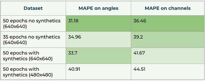 正如预期的那样,高分辨率图像提供了更好的质量。令人意外的是,合成数据并没有带来增益,甚至在某些地方比“有机”数据更差。这可以解释为图像的现实感较弱,以及可能的均匀性(背景图像和管道末端有限)。