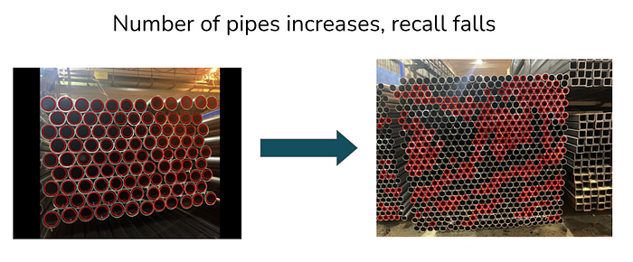 在分析结果时,我们注意到一个有趣的模式:模型能够自信地处理一定数量的管道的捆绑,但当超过这个阈值时,质量急剧下降——有些物体根本无法被检测到。