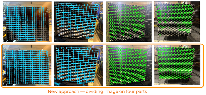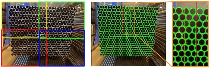 为了解决这个问题,我们提出了一个想法,将图像分成四个部分,稍有重叠,并在每个部分上单独运行YOLO(见图7)。之后,我们通过确定一个管道中心到另一个管道边缘的距离来找到所有重叠的管道;在重叠的管道中,只保留较大的那个。