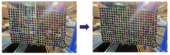 此外,照片中的一束管道应该大致相同大小。因此,为了过滤掉异常值,我们删除了那些明显大于或小于照片中所有管道平均大小的管道。为此,我们找到了所有管道的中位面积,并删除了与中位面积差异很大的管道。这有助于在密集堆栈上稳定计数,并减少大型捆绑的遗漏。