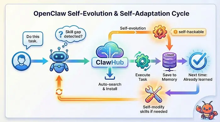 OpenClaw 最独特的功能是自我进化,这不仅是定制,还指代理可以扩展自己的机制。
