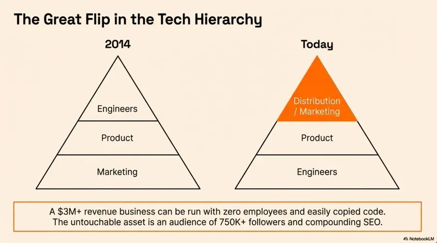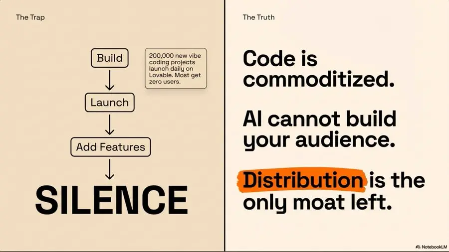 人工智能使代码商品化,而分发渠道则成为稀缺技能。那些懂得如何获取客户、建立受众群体并赢得关注的人,才是真正的行业领军者。