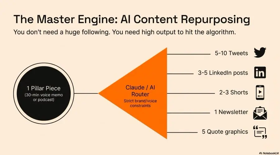 从本周开始:录制一段 30 分钟的内容。转录。按照特定的格式说明导入 Claude。优化你的语音风格(而不是 AI 默认的生硬格式)。安排发布。每周重复。三个月后,你的内容量将超过竞争对手。