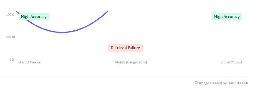 注意力分散:从技术上讲,随着情境窗口的填充,模型的注意力机制——即其专注于特定信息的能力——会越来越分散。这被称为“迷失在中间”现象。