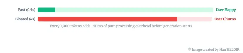 更糟糕的是,每一个令牌都会增加几毫秒的延迟。这些毫秒会累积起来。你的用户会注意到这一点。你的转化率会下降。你精心设计的AI系统会变成“没人愿意用的慢玩意儿”。