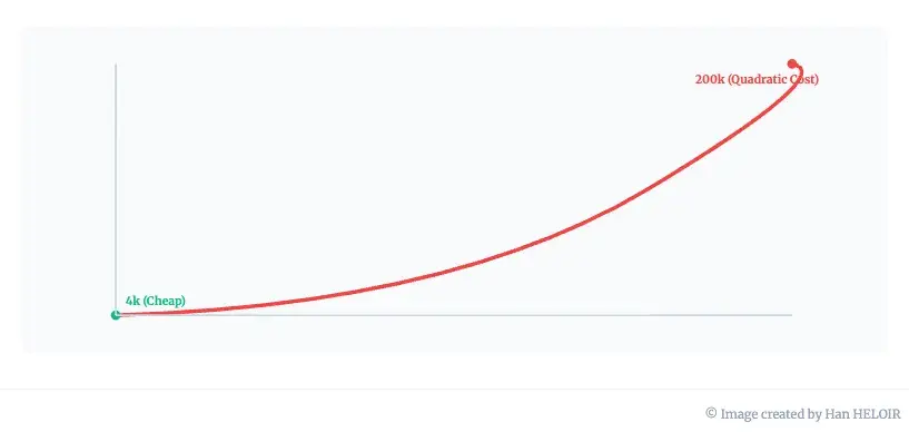 让我们具体说明一下。处理一个包含8000个词元的文档需要模型计算大约6400万次注意力操作(8000⁰²)。如果将上下文窗口扩展到12.8万个词元(GPT-4o的大小),则需要进行164亿次操作。这意味着,上下文窗口仅增加了16倍,计算量却增加了256倍。