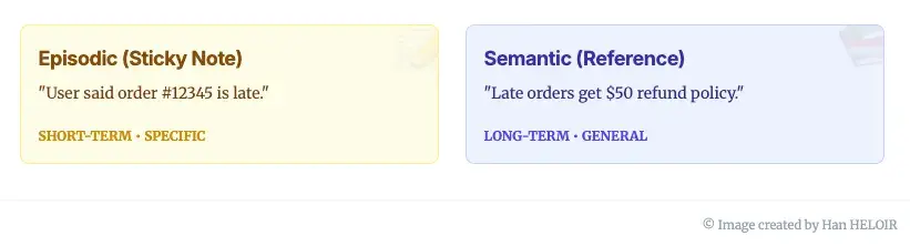 - 语义记忆(参考手册):“发货规则是什么?” 贯穿所有会话的结晶化知识和事实。