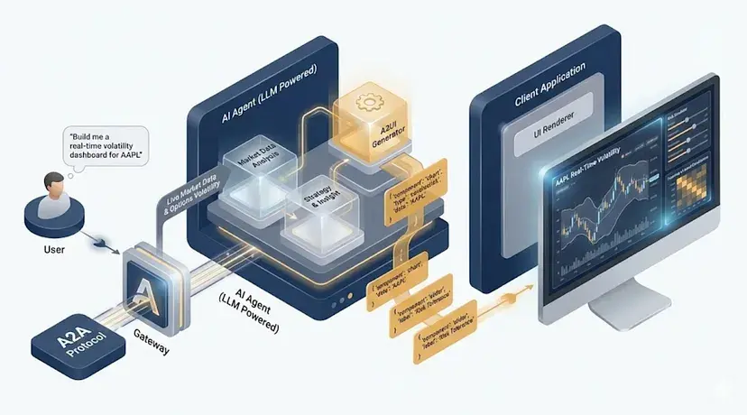 传统的量化工具,例如基于Python的交易平台中的工具,通常会将您限制在预定义的仪表盘中。想要添加新的波动率指标?您又得编写HTML、CSS代码,或者费力地使用Dash或Streamlit等库。A2UI彻底颠覆了这一现状,它赋予代理根据上下文自主设计和更新用户界面的能力。由语言学习模型 (LLM) 驱动的代理可以解读自然语言请求(例如,“为我构建一个用于监控苹果期权波动率的仪表盘”),并输出 JSON 规范,客户端会将其渲染成交互式元素,例如用于模拟的按钮、用于时间序列数据的图表或用于参数调整的表单。