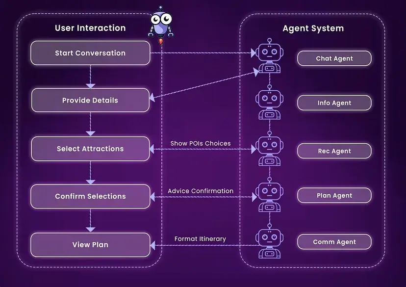 - 定义角色:数据代理用于输入,分析代理用于计算,UI 代理用于输出。
