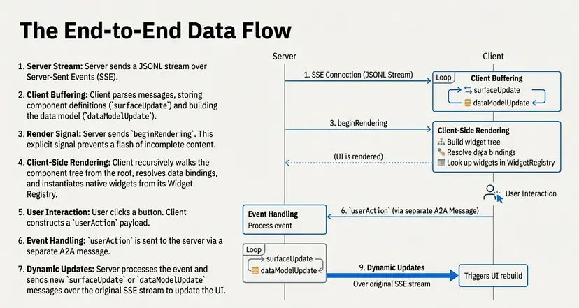 其中,n 为代理跳转次数,ti 为每次跳转的处理时间(例如,数据获取耗时 200 毫秒,分析耗时 150 毫秒),trender 为客户端渲染时间(通常小于 50 毫秒)。A2UI 通过增量更新进行优化:代理无需进行完整的重新渲染,而是通过引用组件 ID 来修补更改,从而在动态仪表板中将 trendert_{render}trender 的延迟降低高达 80%。
