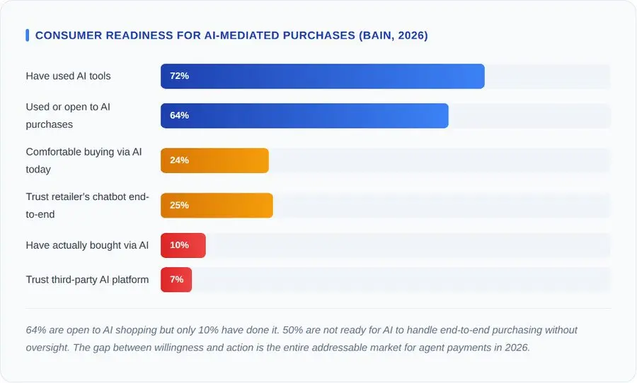 然而,有一个数字应该让这个领域的每一位开发者都感到警醒:只有7%的消费者信任第三方人工智能平台为他们购物(贝恩公司,2016名美国受访者,2026年数据)。协议和基础设施都已准备就绪,但信任却尚未建立。三十年前,互联网选择广告是因为小额支付成本过高。如今,小额支付成本低廉,但信任却价格不菲。能够弥合这一鸿沟的开发者将引领互联网商务的下一个时代。支付是一种商品,而信任却需要时间去维系。