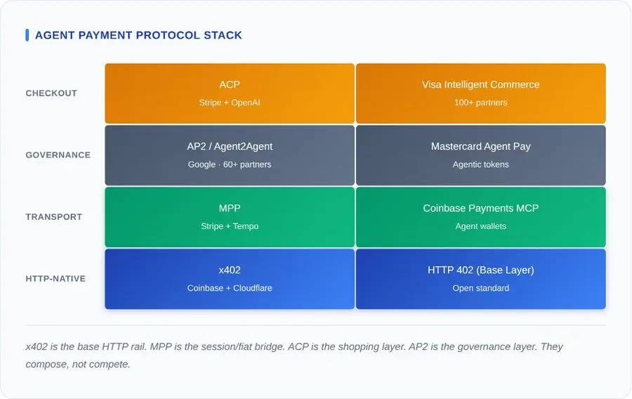 谷歌的 AP2 协议作为治理层位于所有这些之上。AP2 拥有 60 多个创始合作伙伴,包括 Adyen、美国运通、蚂蚁集团、Coinbase、Etsy、Intuit、JCB、万事达卡、PayPal、Revolut、Salesforce、银联和 Worldpay,它定义了代理商如何发现服务、交换授权和委托权限。AP2 刻意保持与支付方式无关。 AP2授权可以通过x402、MPP、Visa或Mastercard进行支付。