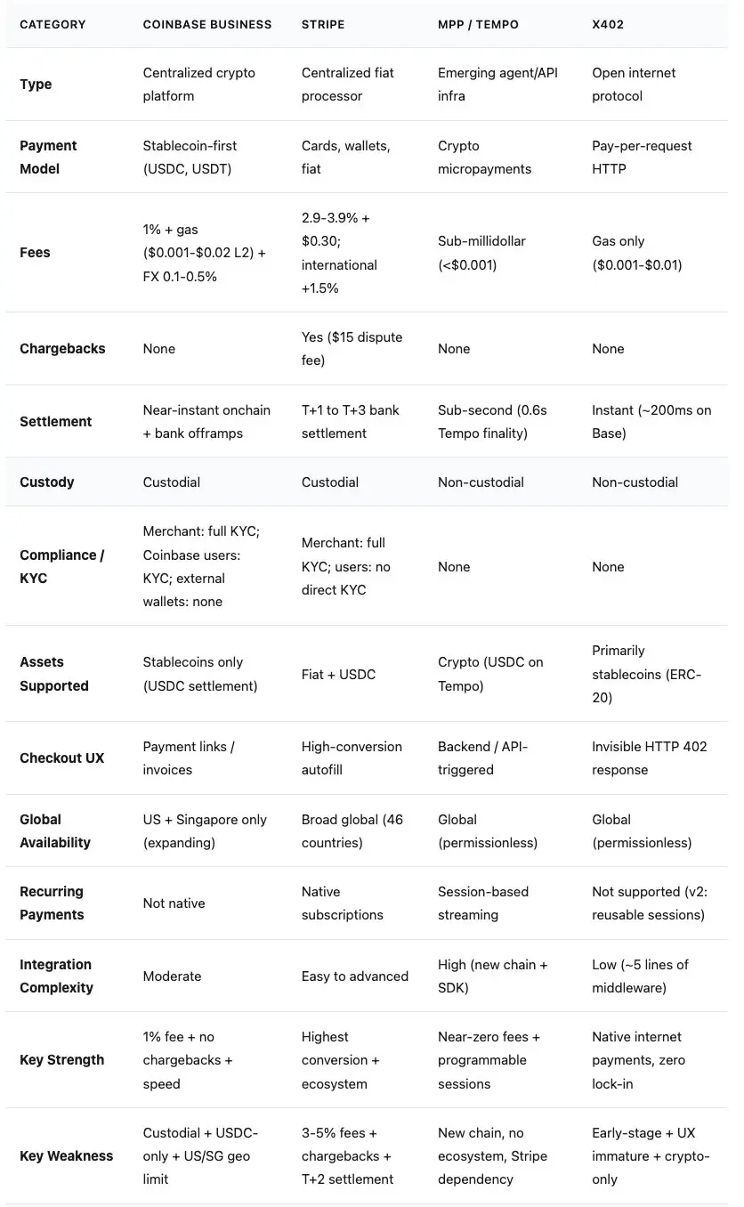 Coinbase 的优势在于其中立性。Stripe 是一家支付处理商,出于商业利益考虑,会将交易留在其平台上。Coinbase 将 x402 构建为一个开放协议,并将治理权移交给了一个基金会。但 Coinbase 的平台发展历程较为复杂:Commerce 将于 3 月 31 日停止运营,Coinbase Business 是托管型服务,且仅限于美国/新加坡地区,结算会自动将所有交易转换为 USDC。开放协议本身是清晰的,但其背后的平台正处于迁移过程中。