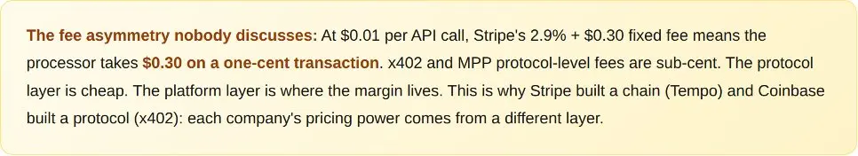 对开发者而言,监管方面的影响是:无需许可的协议在受监管市场需要有许可的封装。x402 的开放式促进者模型目前在美国行之有效。但在欧盟,如果没有 MiCA 合规性,则无法运行。MPP 对 Stripe 的依赖在加密原生领域是一个弱点,但在 Stripe 现有许可证提供合规层的情况下,这反而是一个优势。在每个司法管辖区最终胜出的协议将是能够解决监管问题的协议,而不是拥有最佳开发者体验的协议。