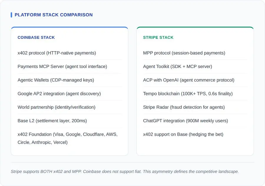 抛开协议层面,平台战略便显露无疑。两家公司都在构建全栈代理商务生态系统。协议仅仅是更大格局中的支付层。