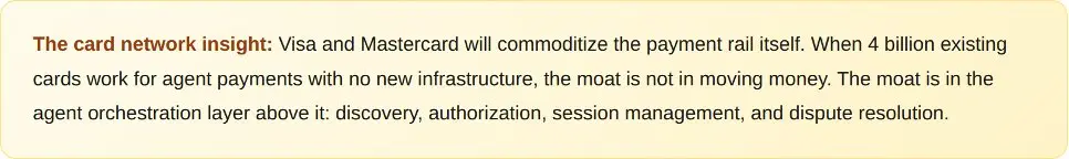 但每个人都在问哪个协议会胜出。这是一个错误的问题。支付轨道是一种商品。Visa 每年处理 14 万亿美元的交易。万事达卡和桑坦德银行于 2026 年 3 月 2 日完成了欧洲首笔 AI 代理支付。当 40 亿张现有银行卡可用于代理交易时,资金转移协议就成了基本要素。真正的护城河是编排层:代理决定购买什么、从谁那里购买以及如何验证信任的系统。