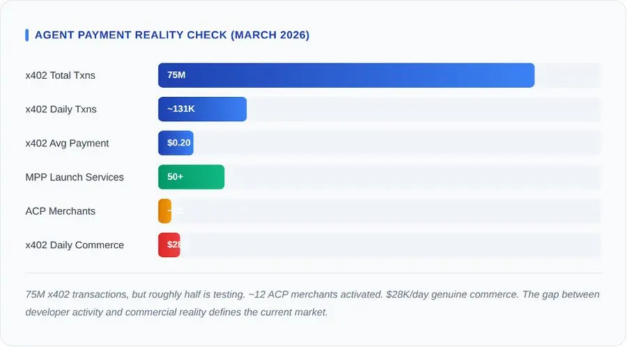 截至 2026 年 3 月,链上数据如下:日交易量约 13.1 万笔,日交易额约 2.8 万美元,平均支付金额 0.2 美元。CoinDesk 的分析(2026 年 3 月 11 日)估计,其中约一半是开发者测试和集成探测。年化总交易额:约 1000 万美元。剔除测试后,年化真实交易额:约 500 万美元。对于一个由 Coinbase、Cloudflare、Visa 和 Google 支持的协议而言,这只是种子阶段的指标。该协议运行良好,但市场尚未成熟。