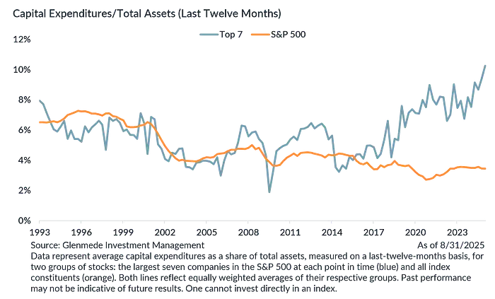 七巨头的集体资本支出在短短六年内从占标普500总资本支出的约10%飙升到30%。Alphabet、微软、Meta和亚马逊预计2026年将在AI基础设施上合计投入近7000亿美元。Google仅2025年就承诺了750亿美元。Meta计划投入650亿美元,对应1850亿美元的收入;那是销售额的35%直接进入数据中心。