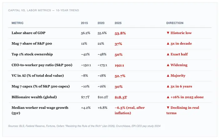 所以当Nvidia飙升800%时,谁受益?当七巨头推动60%的市场收益时,谁捕获了那个?当AI相关公司估计占2025年10月美国股市收益的80%时,谁的净资产增加了?