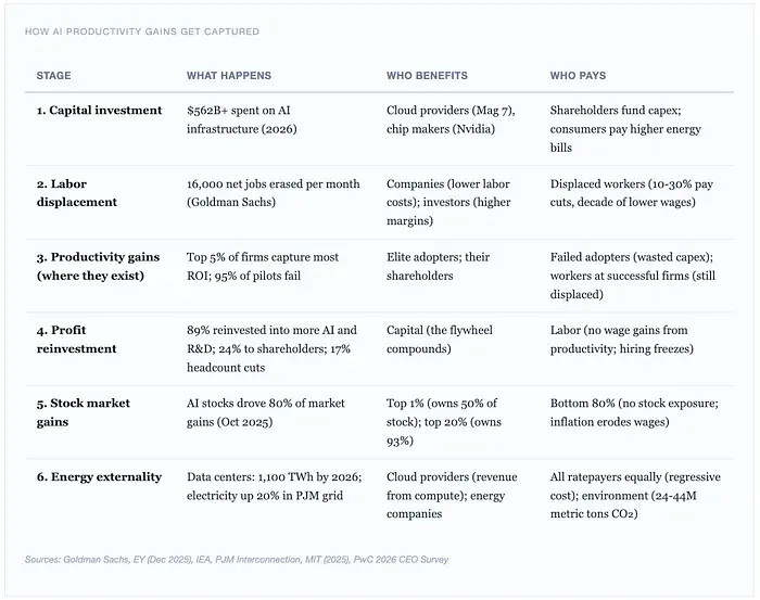 AI投资:GDP增长的92%。AI生产力收益:56%的采用者无法测量。AI工作岗位流失:每月净16,000。AI财富集中:最富有的1%拥有50%的股票。AI能源成本:人人承担的累退税。