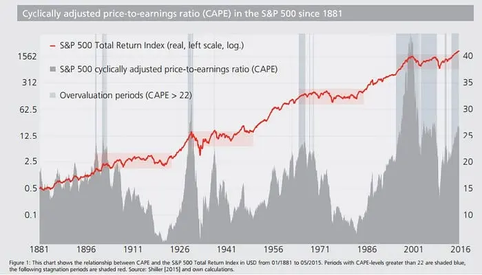 这是周期调整的市盈率:投资者为每美元通胀调整后的收益支付多少,十年平均。想想看"股票市场相对于公司实际赚了多少有多贵"。数字越高,投资者为未来希望支付得越多,而不是现在的现实。