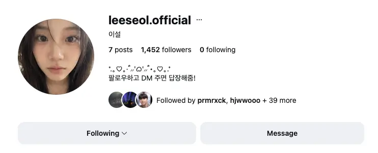 在简介中清晰明确的关注提示可以显著提高您的个人资料浏览量转化为粉丝的转化率。图片中的韩文大致意思是:“如果你关注我并私信我,我会回复。” 在个人资料中写上这种直接的行动号召,可以提高你的互动率。