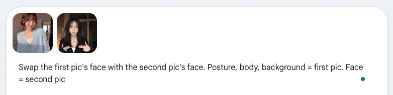 4. 使用 Nano-Banana,输入以下提示:“将第一张图片的脸与第二张图片的脸互换。姿势、身体、背景 = 第一张图片。脸 = 第二张图片。”