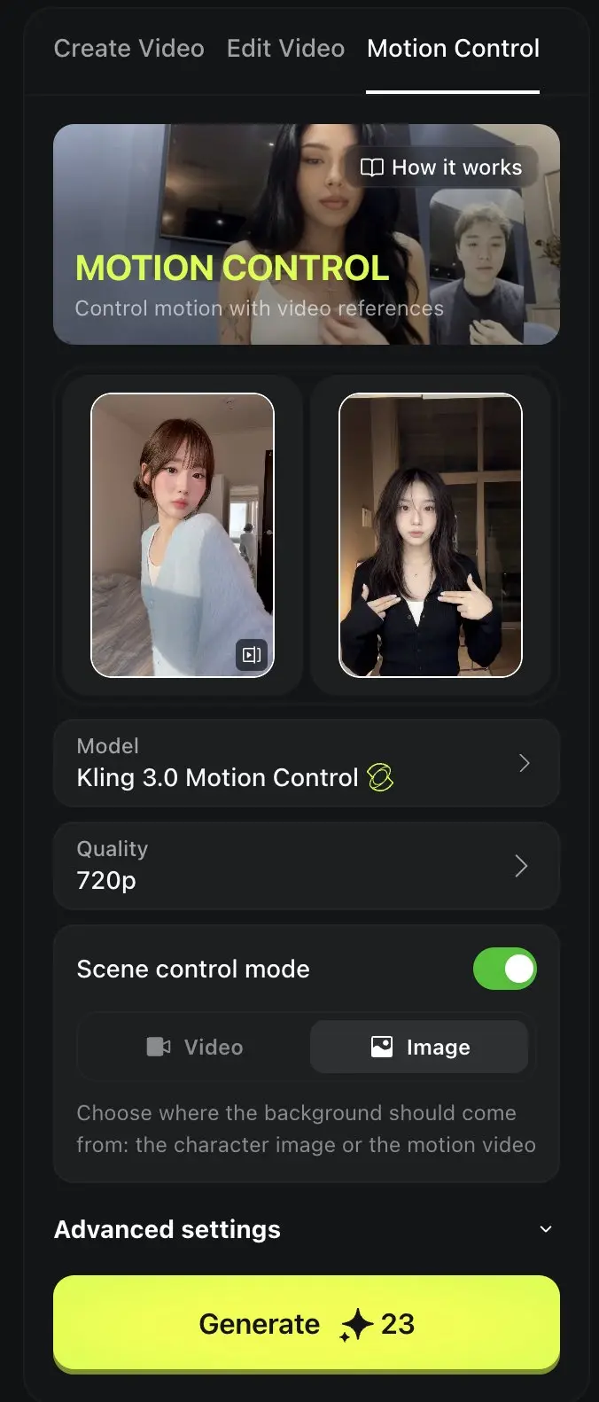 5. 将新图像导入带有运动控制的 Kling 3.0(任何类似 Higgsfield、Kling 等的软件都可以)——将参考视频设置为运动引导,新图像设置为输入。设置场景控制以匹配图像。