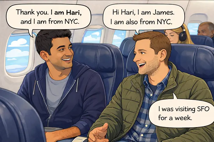 想象您正在从SFO飞往NYC的航班上。到达座位后,您注意到别人坐在那里。您请他们移动到指定的座位,他们同意了。这个小对话成为破冰器,您开始了对话。